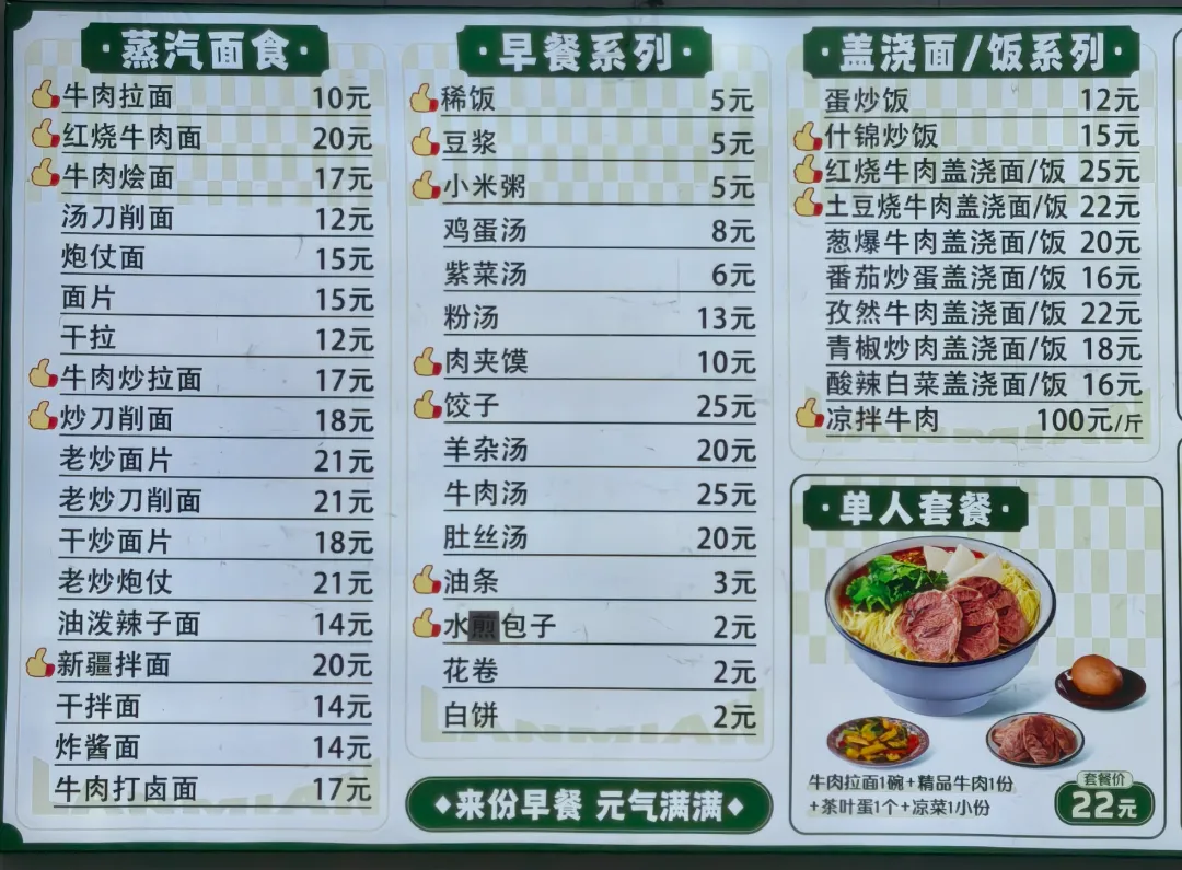 初二一早起来,找了家早餐店,清真的,顺便给车充了电。店内墙上的宣传海报、菜单,牛肉拉面: