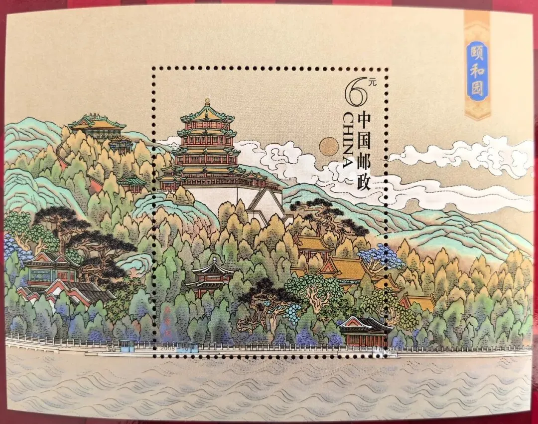 这枚小型张邮票上的图案是颐和园的佛香阁,高耸云表。