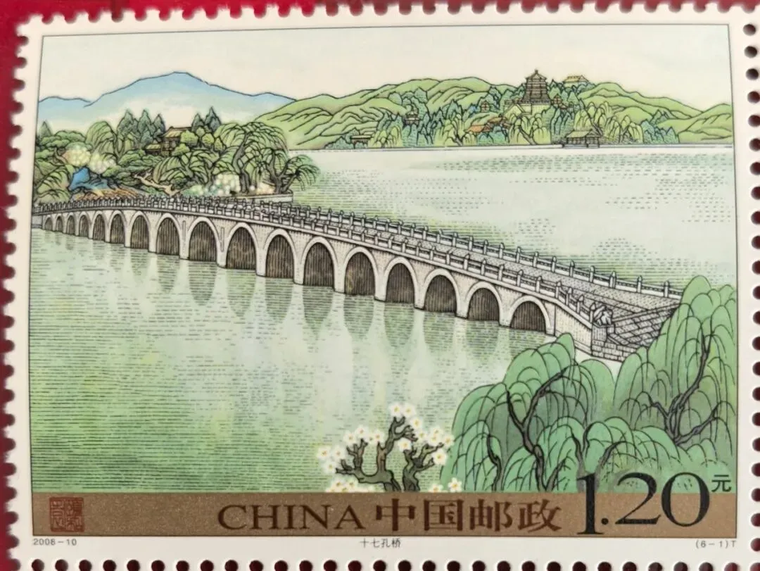 这枚邮票上的图案是颐和园的春景,以十七孔桥为主角,远处是万寿山佛香阁。