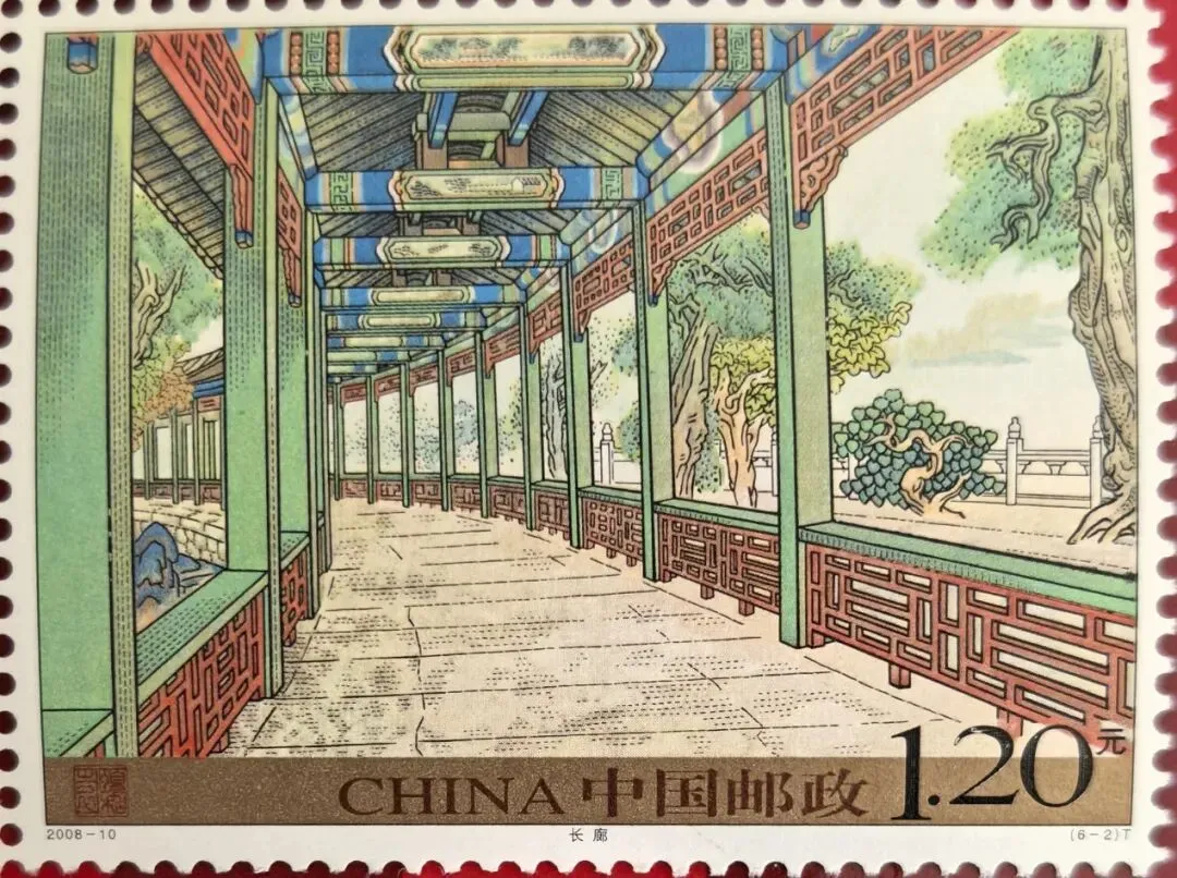 这枚邮票上的图案是颐和园的长廊,一条廊间每根枋梁上都绘有精美彩画的画廊。