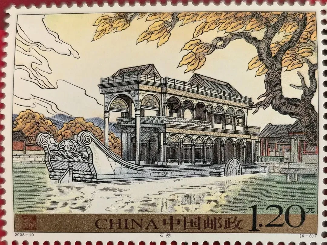 这枚邮票上的图案是颐和园的石舫,一条青石雕刻的石船似漂浮在水面上,两层的船楼精致大方。