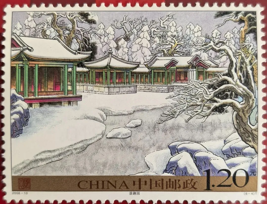 这枚邮票上的图案是颐和园的谐趣园,几座风格略有不同的亭台、楼、榭被游廊连在一起,在冰天雪地里显得格外静谧。