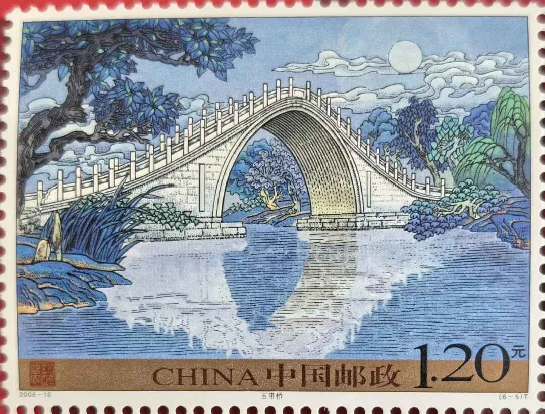 这枚邮票上的图案是颐和园的玉带桥,一座由汉白玉和青白石修建的石桥在月色下投影到湖水中,闪闪发光,洁白无瑕,水中的倒影宛如一条玉带。