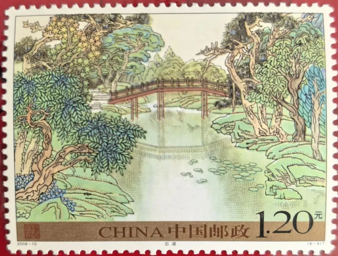 这枚邮票上的图案是颐和园的后湖,清澈的溪水两旁绿树成荫,一座木桥横跨溪流,颇有野趣。