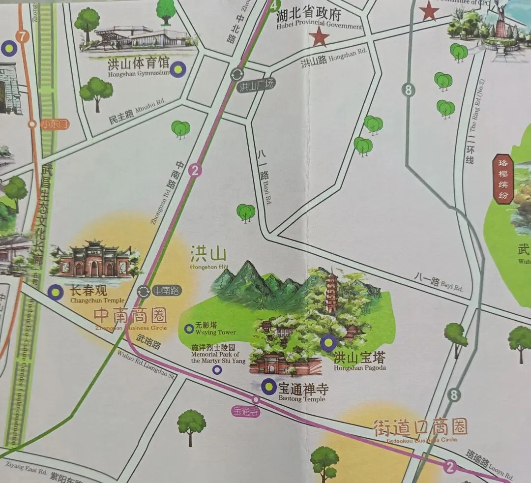 “洪山是武汉市江南的绿宝石洪山地跨武昌、洪山两区,是武汉市长江以南的一块宝地,从高处看,似绿宝石,而无影塔、宝塔、宝通寺是上面美丽的明珠。