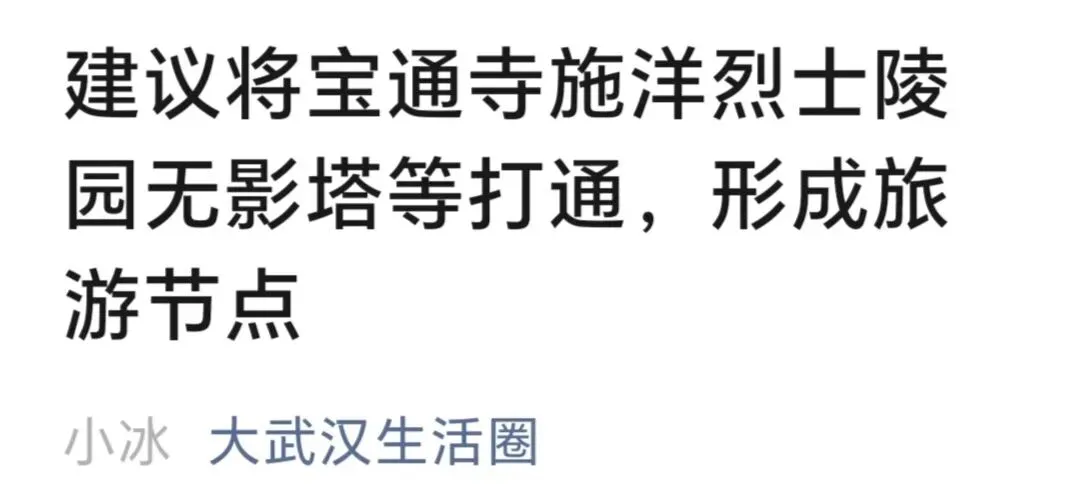 我作为老武昌人,期待武汉市唱好洪山文化旅游的大戏,协调现在多个驻洪山单位机制,做好洪山景区新规划,让洪山的无影塔、洪山宝塔与宝通寺极具文化价值的“三位一体”文旅组合,成为新的旅游亮点,造福本地人民和外地、外国游客。