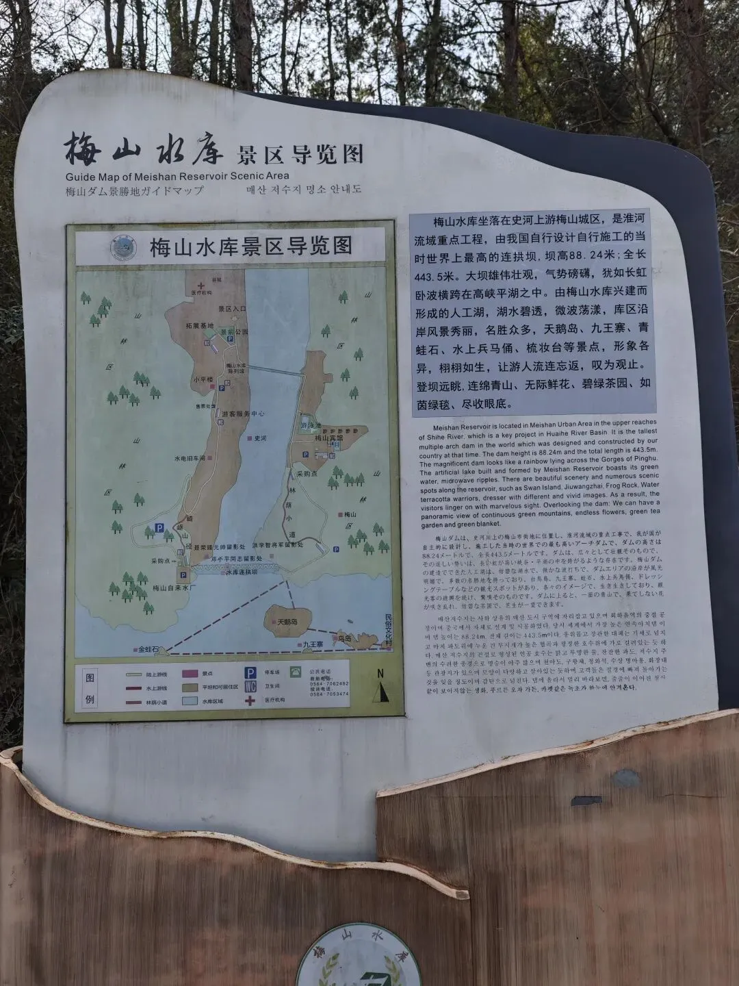 梅山水库坐落在史河上游梅山城区,是淮河流域重点工程,由我国自行设计自行施工的当时世界上最高的连拱坝,坝高88.24米;全长443.5米。大坝雄伟壮观,气势磅礴,犹如长虹卧波横跨在高峡平湖之中。由梅山水库兴建而形成的人工湖,湖水碧透,微波荡漾,库区沿岸风景秀丽,名胜众多,天鹅岛、九王寨、青蛙石、水上兵马俑、梳妆台等景点,形象各异,栩栩如生,让游人流连忘返,叹为观止。登坝远眺,连绵青山、无际鲜花、碧绿茶园、如茵绿毯、尽收眼底。