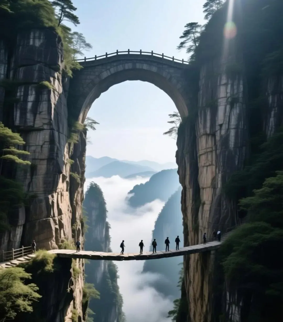 穿过迷魂台,往深处走便是天下第一桥。这是世界上垂直高差最大的天然自生石板桥,横跨在两座万丈绝壁之间。桥面宽约2米,长20余米,浑然天成,没有一丝人工雕琢的痕迹。走在桥上,脚下是深不见底的峡谷,桥下云雾翻涌,风穿过峡谷发出轻响,仿佛踩在天地交界的秘境之上。