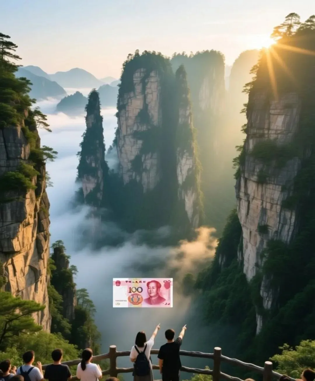 途中偶遇的“百元大钞取景地”,更是藏着意外惊喜。几座并列的石峰紧紧相连,轮廓竟酷似旧版百元人民币上的图案,不用刻意寻找,站在观景台远眺,峰林的轮廓与纸币图案高度重合,大自然的巧合与人文记忆碰撞,引得游客纷纷驻足打卡。