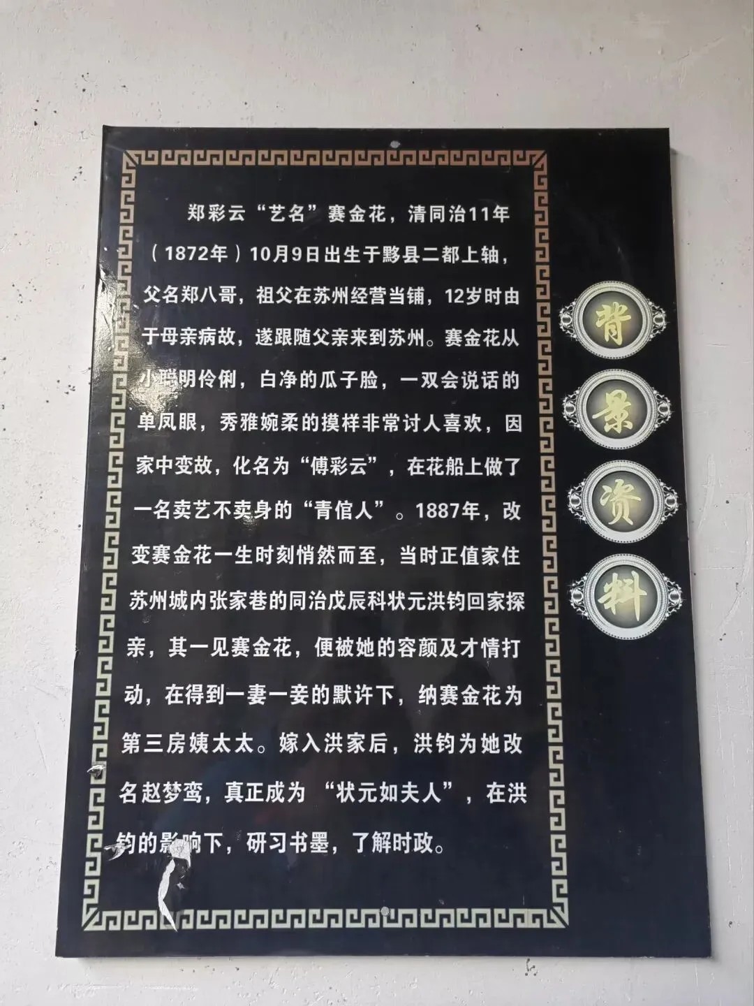 清同治十一年(公元1872年),黟县龙川上轴村郑八哥家诞下一位女婴,起名郑彩云。郑彩云幼年时就深受徽州文化的熏陶,内心深深种下忠孝节义的徽州印记。然而命运弄人,移居苏州的郑彩云因父母双亡,13岁堕入风尘,成为苏州花船上的一名色艺双绝的"清倌人",后得遇清末状元洪钧,从而谱写了一段旷世奇缘。与洪钧结合是赛金花一生命运的转折,就这样她从"状元夫人"、"公使夫人",一步步走上清末历史的舞台,开始了一段段传奇的故事。 郑彩云"艺名"赛金花,清同治11年(1872年)10月9日出生于黟县二都上轴,父名郑八哥,祖父在苏州经营当铺,12岁时由于母亲病故,遂跟随父亲来到苏州。赛金花从小聪明伶俐,白净的瓜子脸,一双会说话的单凤眼,秀雅婉柔的摸样非常讨人喜欢,因家中变故,化名为"傅彩云",在花船上做了一名卖艺不卖身的"青倌人"。1887年,改变赛金花一生时刻悄然而至,当时正值家住苏州城内张家巷的同治戊辰科状元洪钧回家探亲,其一见赛金花,便被她的容颜及才情打动,在得到一妻一妾的默许下,纳赛金花为第三房姨太太。嫁入洪家后,洪钧为她改名赵梦鸾,真正成为"状元如夫人",在洪钧的影响下,研习书墨,了解时政。 好景不长,光绪十九年(1893年)洪钧抱病而死,洪钧生前留给赛金花的5万两银子养老费被洪钧的族弟洪銮侵吞后,另一个不满11个月的孩子也夭折,何氏(洪钧的大夫人)又抢走了赛金花的爱女德官,迫使她离开了洪家,辗转去了上海。在上海挂起了"书寓"的牌子,改名曹梦兰。在这期间,红极一时。曾经为李鸿章浅斟低唱,还有太子少宝杨立山、上海道台蔡钧、江西巡抚德晓峰等重臣作陪。经内阁中书汪康年介绍,认识了《时务报》主编梁启超和时任江苏候补知府爱国志士谭嗣同。之后,赛金花又去了北京。 光绪二十六年(1900年)七月,八国联军攻下北京,慈禧携光绪帝出逃。几个德国兵敲开了赛金花住在高碑胡同的大门,她用流利德语和德兵攀谈,德兵在看到赛金花与德国皇后的合影后,向时任联军统帅瓦德西报告,第二天瓦德西派人把她接入皇宫,开始了著名的"瓦赛公案"。瓦德西委托她办理军粮,她就此提出了停止杀戮百姓,不破坏文化古城的建议,并被采纳。此时的赛金花成了人们心目中的观音菩萨,人称"赛二爷"。名公世卿,王孙公子纷纷与她攀交情,叙旧谊。义和团时期,德国公使遇刺后,克林德夫人坚持要西太后偿命,皇上赔罪,使和谈陷入僵局。李鸿章请求赛金花从中斡旋,赛金花几经奔走,终于说服了克林德夫人以徽州旌表的形式建牌坊纪念。一战德国战败后,在拆除克林德牌坊并建公理战胜坊的典礼上,赛金花也应安徽同乡段祺瑞的邀请出席,并见到当时大名鼎鼎的辜鸿铭。辜鸿铭对赛金花说:"在这件事上,你是有功的,大家会记得你的。"赛金花泪流满面。也许,在那个动乱的年代,看似风光的她,深藏着一颗爱国之心,只是,没有人愿意真正了解她,他们更加关注的是她表面的一些东西。