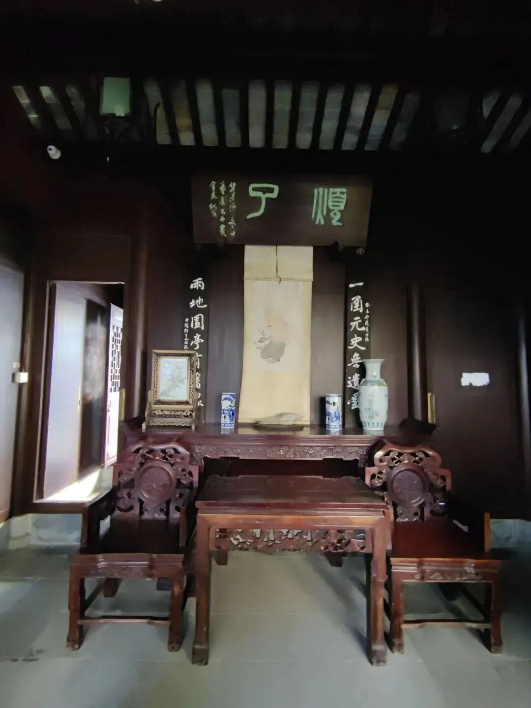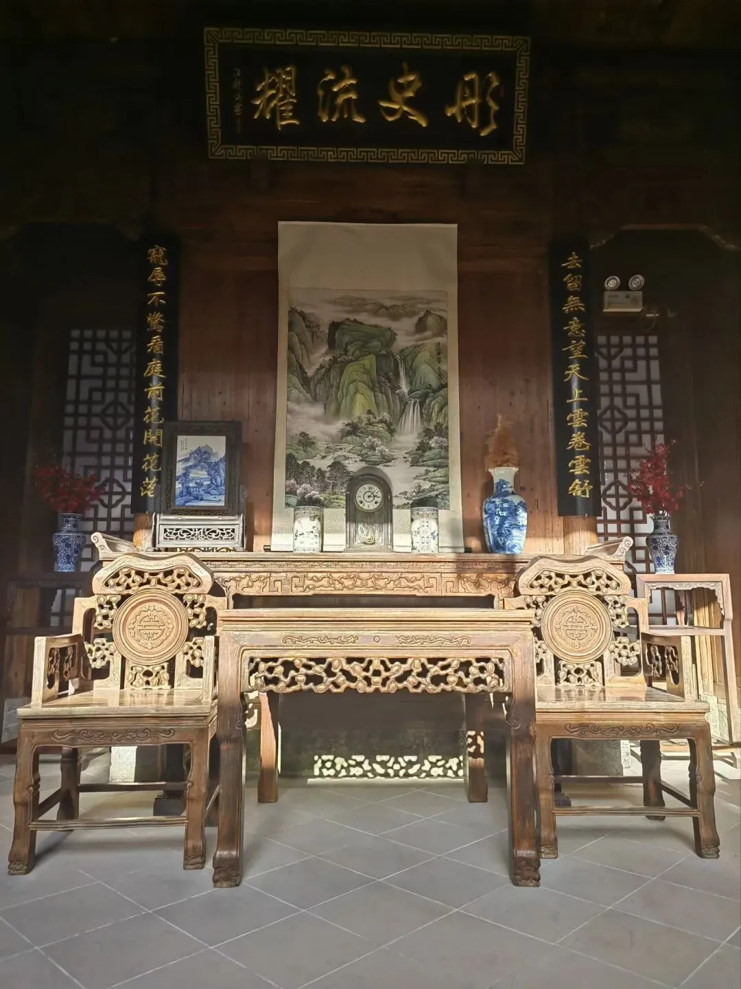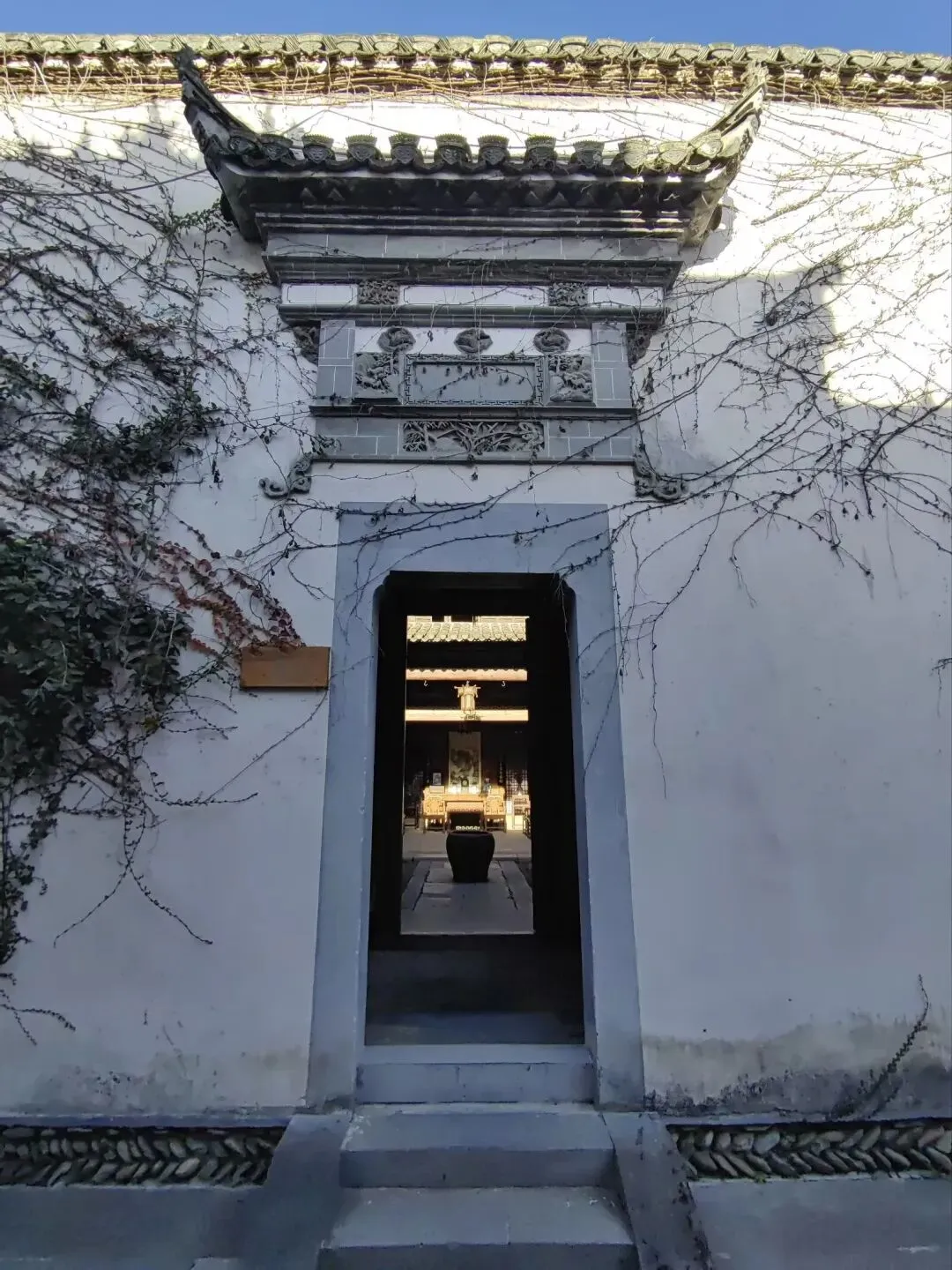 门额:“大樨香庭”,“樨”即桂花,寓意庭院中桂花盛开时香气四溢。- 楹联:- 上联:“爱竹不除当路笋”- 下联:“惜花留得碍人枝”这副对联出自清代李渔的《闲情偶寄》,表达了一种顺应自然、不刻意雕琢的园林美学与处世哲学。