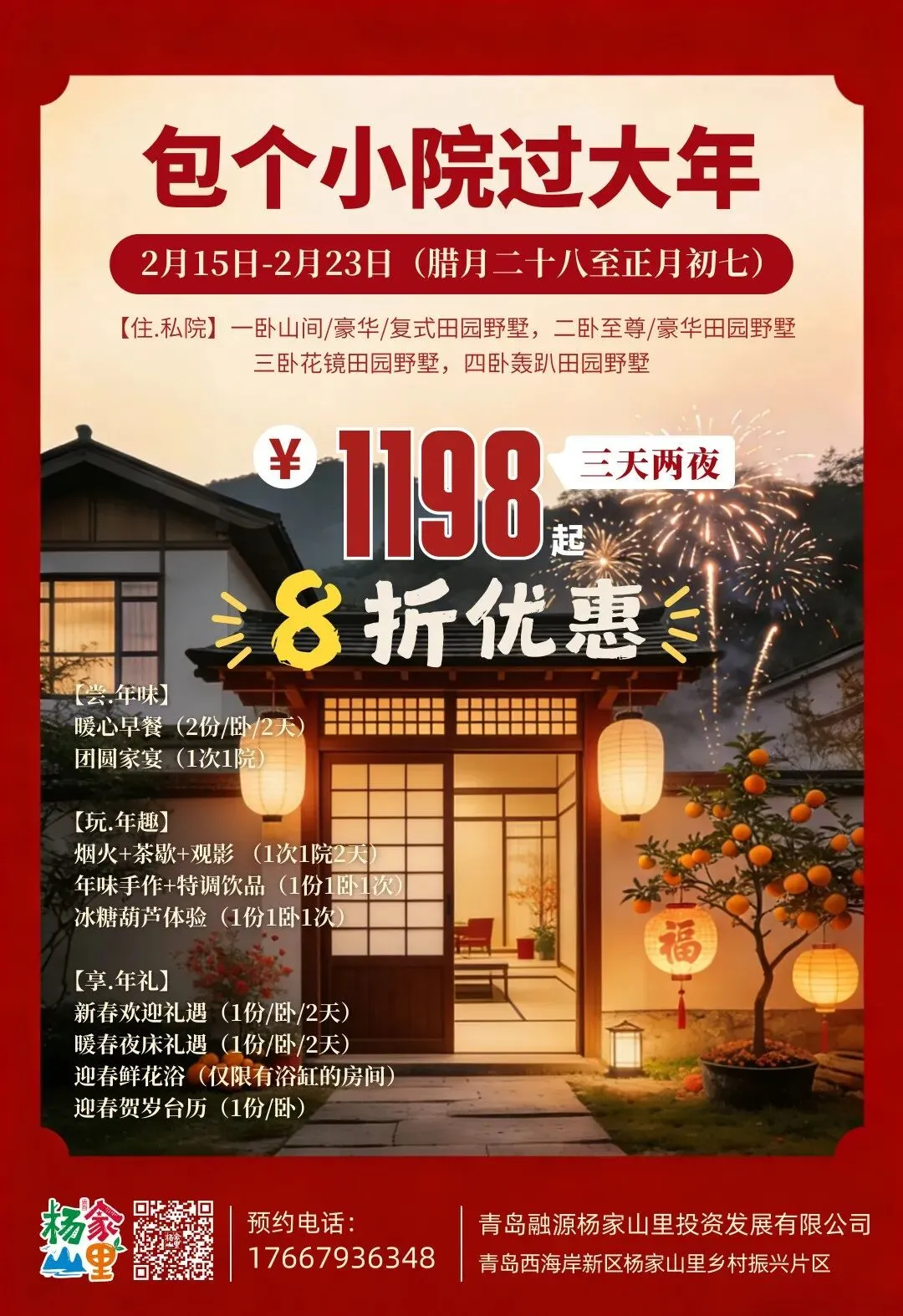 整院私密,全家共享山居年味!焰火、福灯、糖球体验,新春礼遇,守岁迎春更有味。
