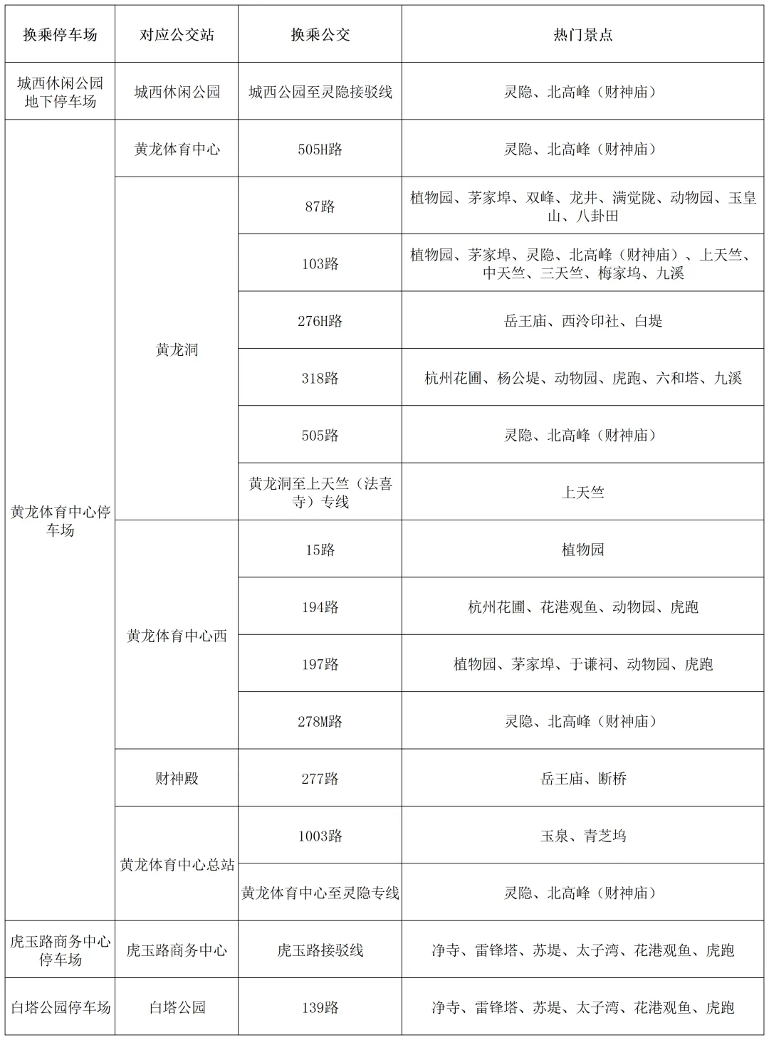 北面有杭州城西休闲公园、黄龙体育中心、省人民大会堂3个换乘停车场,东面和南面有尚城利星、山南印、白塔公园、虎玉路商务中心4个换乘停车场,每个换乘点都设有公交接驳线路,带您直达主要景点。出发前用导航搜索停车场名称,一路顺畅不绕路!