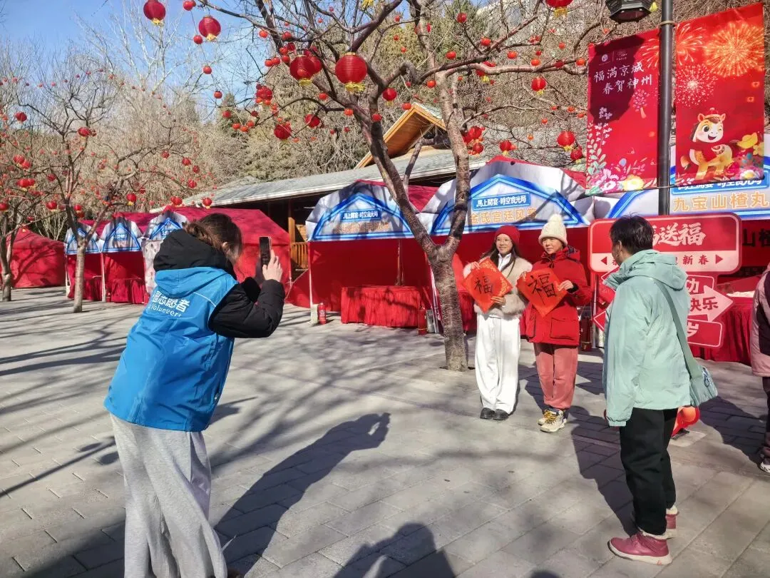 另一边,公园内的写福字、送祝福活动现场热闹非凡,志愿者有序组织前来游园的市民游客参与活动,热情引导大家提笔写福、挥毫送福。他们有的归置维护书写台,有的帮游客整理写好的福字,将一幅幅饱含祝福的作品送到对方手中,有的耐心帮游客拍照留念,定格下一个个温馨瞬间,为大家留下专属的新春回忆。学生党员谢思瑶说:“除夕虽然没能和家人团聚,但在这里和游客们一起写福字、送祝福,感受着大家脸上的笑容,我觉得特别有意义。”