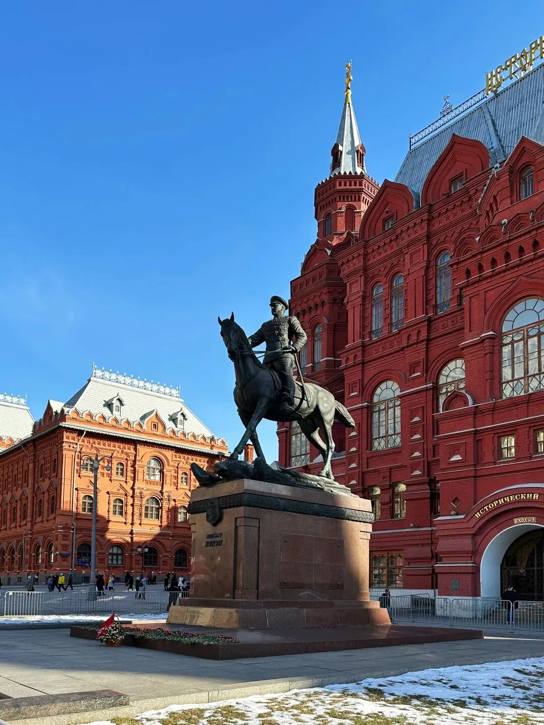红场北侧,一眼就能看见朱可夫元帅骑马雕像,1995年二战胜利50周年揭幕,铁马戎装,英姿凛然,站在雕像前,就能感受到那段峥嵘岁月里的英雄力量。