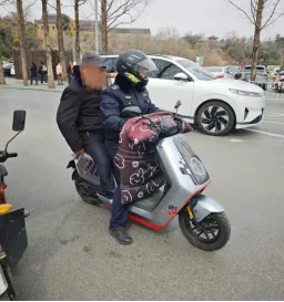 走近才发现,老人的右腿残疾,身旁放着一副拐杖。原来,老人骑着电动三轮车出门,不料前轮被扎破了,车子无法启动。他既不会使用手机,又不认识字,被困在原地束手无策,急得满头是汗。 仇世飞一边安抚老人情绪,一边询问家庭住址。得知老人家住得不远,起初尝试用手机帮老人打车,但由于春节假期景区周边游客爆满,网约车平台长时间无人接单。看着老人行动不便、焦急无助的样子,仇世飞当即决定先送老人回家,再想办法处理车辆。他迅速与附近执勤的同事交接好岗位,叮嘱同事帮忙看管老人的三轮车,随后小心翼翼地将老人扶上自己的电动车,一路慢行将老人平安送回家中。