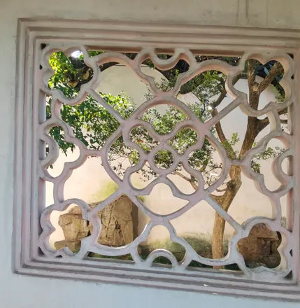 E22:闻妙香室南侧小院子有一个花窗。