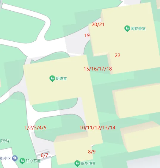 5 E片区(明道堂院子及闻妙香室) 明道堂院子两侧各五个花窗,南侧即瑶华境界大门两侧各两个花窗,明道堂东北靠近闻妙香室,共四个花窗。闻妙香室进门西北围墙转角共三个花窗,闻妙香室南侧小院子有一个花窗。