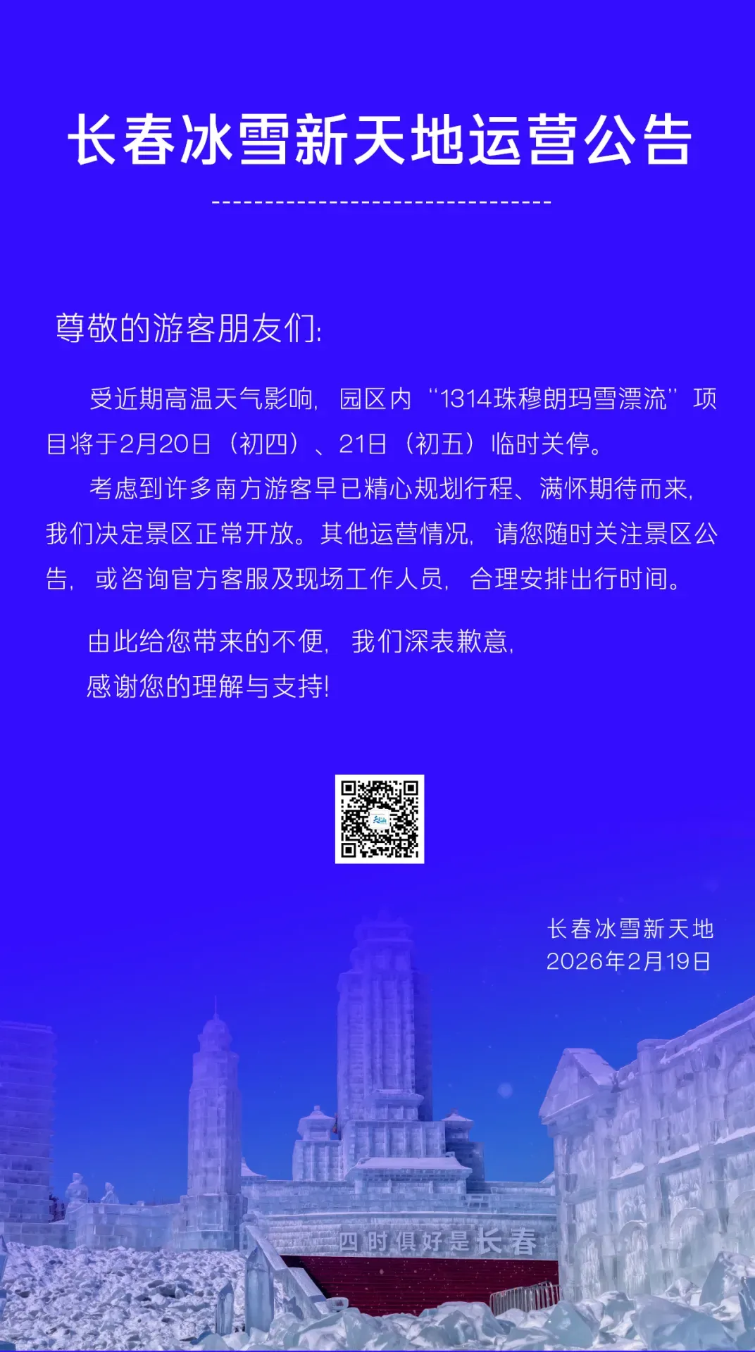 新春佳节,万象更新。为切实保障广大游客的游玩安全与游览体验,结合近期气温持续回升、景区冰面结构发生变化的实际情况,长春净月潭景区现就冰雪项目运营调整事宜公告如下: