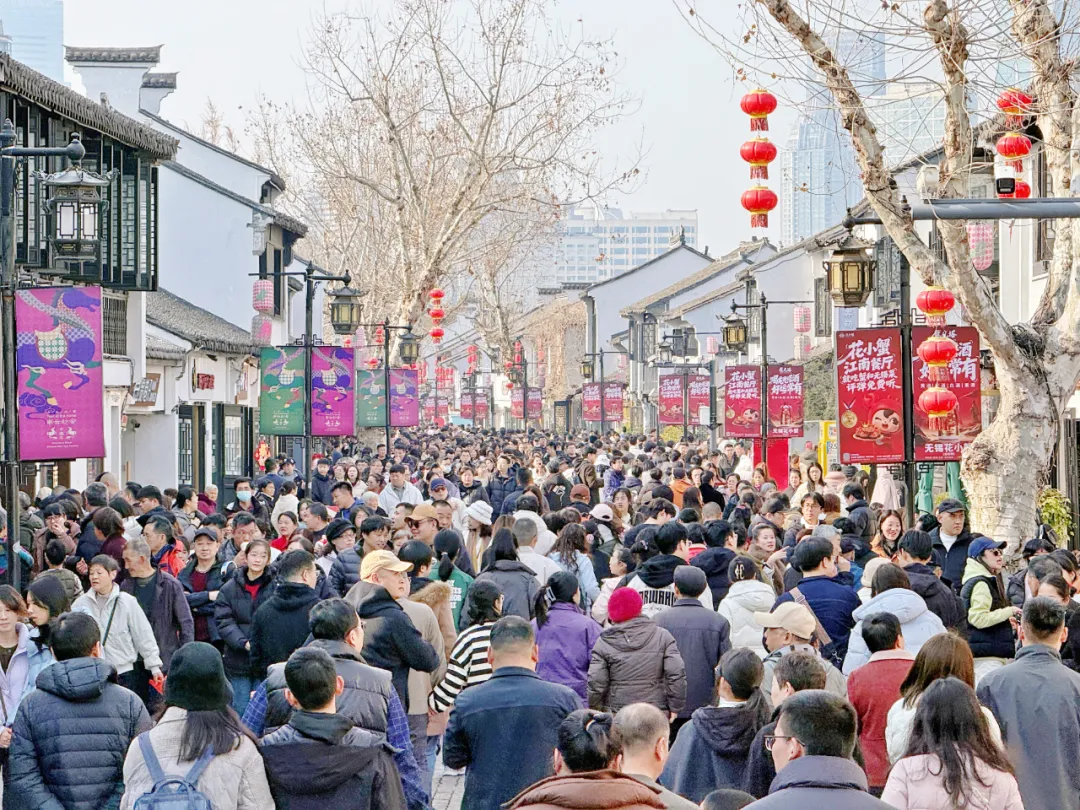 截至2月19日15:00,无锡窑湖小镇当日游客接待量已达最大承载量的90%。为确保游览安全与体验,景区即刻启动限流措施。