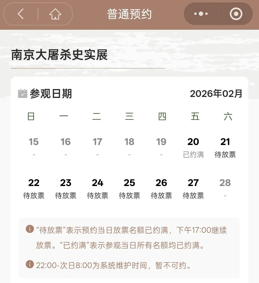 侵华日军南京大屠杀遇难同胞纪念馆、南京大屠杀史实展2月20日已约满,2月21日至2月27日预约显示待放票状态。