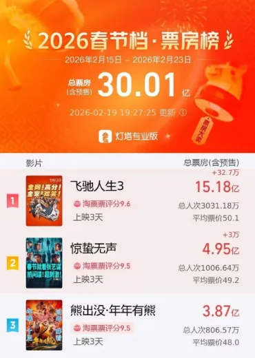 2026年春节档电影总票房破30亿 据网络平台数据,2026年春节档电影总票房(含预售)突破30亿元!《飞驰人生3》《惊蛰无声》《熊出没·年年有熊》位列前三。与此同时,2026年年度电影总票房(含预售)已超过55亿元。