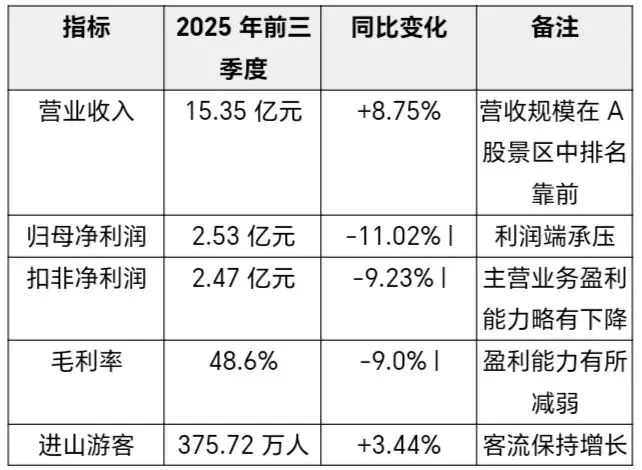 一句话点评:现金流充裕,经营活动产生的现金流量净额为5.01亿元,同比增长22.84%,显示出公司主营业务有较强的造血能力。2025年前三季度,黄山旅游在游客量和营收上保持了稳健增长,但因资源使用费增加,利润端承压,呈现出典型的增收不增利局面。 黄山旅游自身的优势与劣势