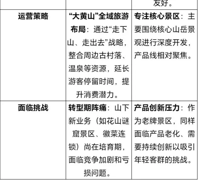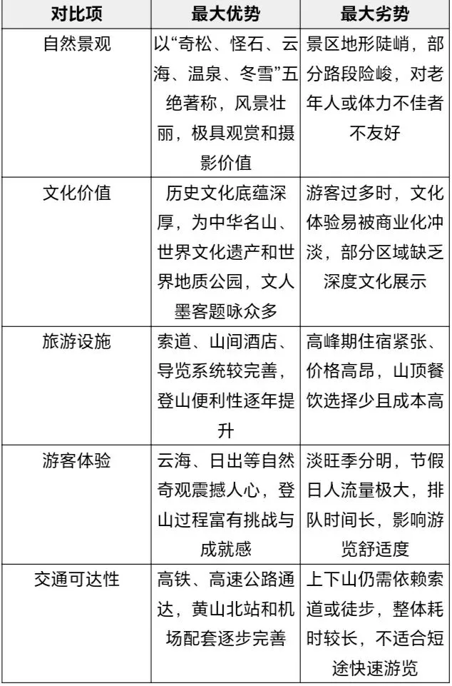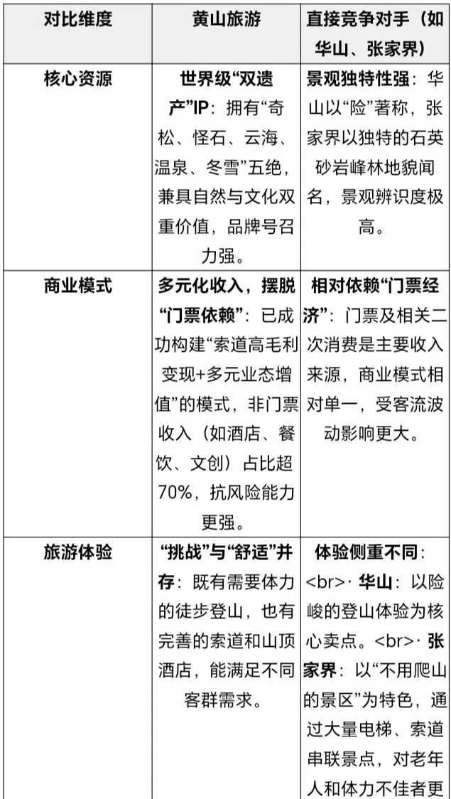 一句话点评:总的来说,黄山旅游最大的优势在于其不可复制的世界级资源禀赋和领先一步的多元化商业布局,这使其在盈利能力与抗风险能力上表现更优。而其主要的对手则凭借各自独特的景观和体验,在市场上占据了一席之地。