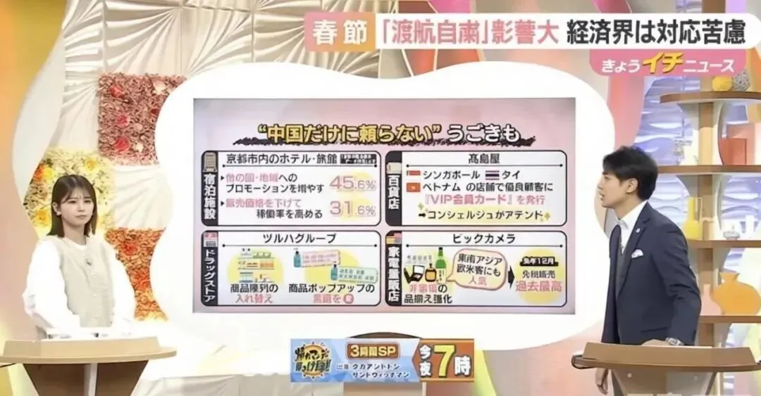 失去中国游客后,日本商家被迫转型:酒店降价求生、多语种揽客;药妆店换用多语言标识;试水VIP会员制;家电量贩店甚至引入非家电品类,只为吸引东南亚与欧美游客填补空缺。