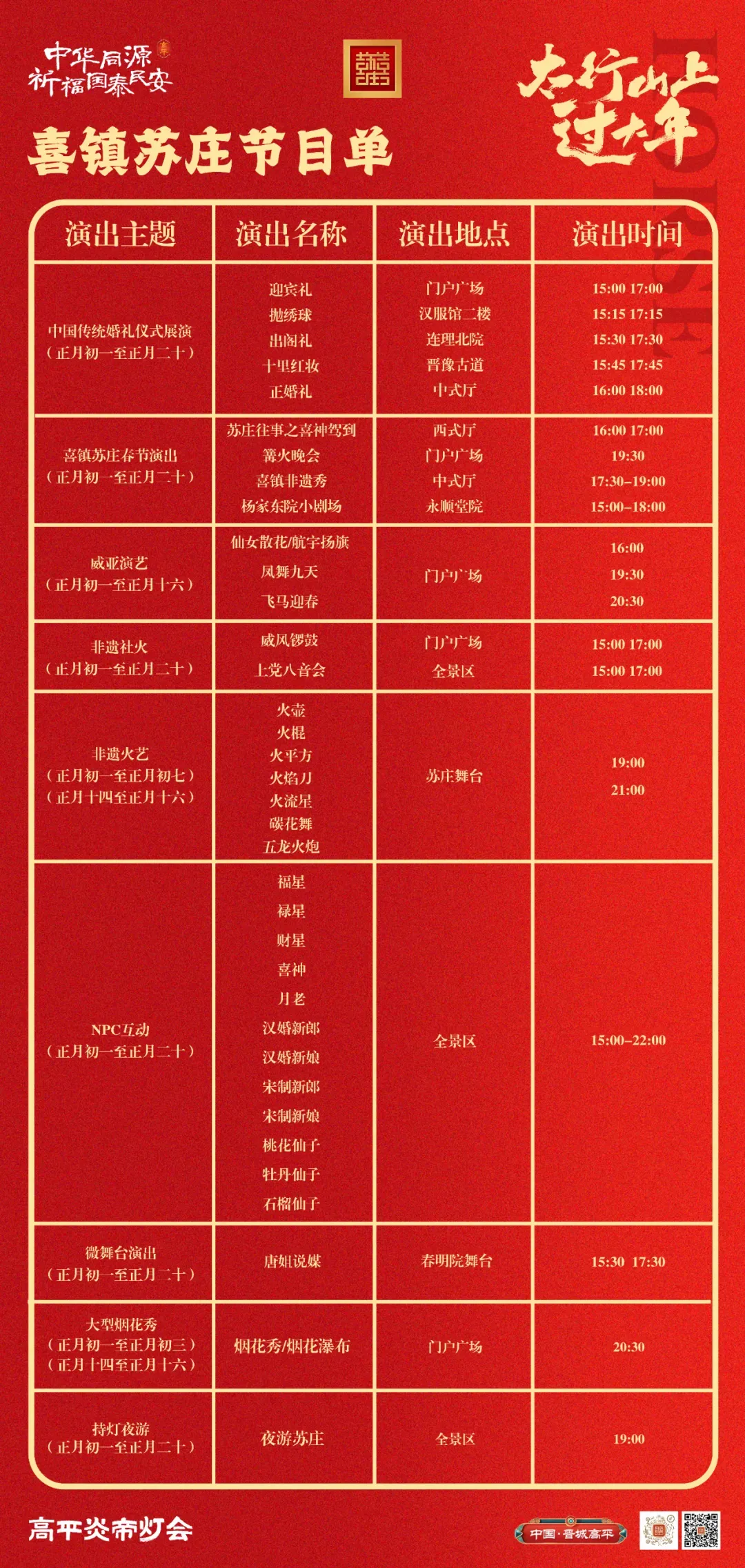 您现在的位置是:首页 > 国内旅游目的推荐 > 正文 国内旅游目的推荐 高平一景区演出时间调整公告! admin2026年02月20日 17:51:14国内旅游目的推荐7 高平一景区演出时间调整公告!关注我们来源:太行人家 喜镇苏庄亲爱的游客朋友们: 感谢大家一直以来对喜镇苏庄的喜爱与支持! 为给您带来更精彩的观赏体验,自正月初三(2月18日)起,景区演出时间调整如下:上午不再安排演出, 所有民俗、火艺、舞台表演统一从下午15:00开始, 轮番上演,精彩不断,年味不减。 请大家合理安排出行时间, 错峰出行、安心游玩,祝您在喜镇苏庄逛得舒心、玩得开心, 马年大吉,万事顺意! 喜镇苏庄景区 2026年2月18日 转载请说明来源于"旅荐网",部分内容转载自网络,如有侵权请联系qlwl@foxmail.com删除 本文地址:https://www.15386.cn/post/115942.html 上一篇 垣曲各景区年味满盈 人气爆棚 下一篇 中国含金量超高的7个AAAAA景区,去过一半很幸福,数数你去过几个? 相关文章 【摩洛哥】实用旅行指南!认真看完少踩98%的坑~ 平潭治愈系旅行!保姆级行程+美食指南 平潭旅游24小时纯吃攻略!! 青海国际旅行卫生保健中心疫苗接种指南,请查收! 【大阪自由行】2026 大阪行程规划攻略:4~6 天大阪一日游路线安排 2026年韩国旅游签证全攻略|单次/5年/10年/团签 确定了,3~5月就去云南旅游,全新纯玩攻略 国庆·中秋畅玩乐天溪,请收下这份旅游攻略 平潭旅游|美食 & 住宿全攻略 旅行小贴士:基孔肯雅热防身攻略(下) 发表评论 取消回复 评论列表 这篇文章还没有收到评论,赶紧来抢沙发吧~