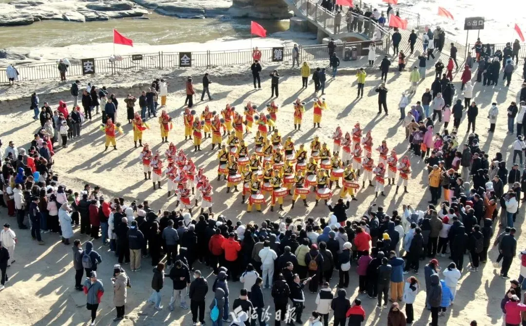 除了观赏壮观的瀑布,岸畔的传统节目表演也非常精彩,锣鼓敲得震天响,原生态唢呐、秧歌轮番上场,《黄河大合唱》实景演出气势恢宏。歌声、鼓声、涛声交织在一起,让大家在看风景的同时,真切感受到浓浓的黄河文化和地道年味儿。