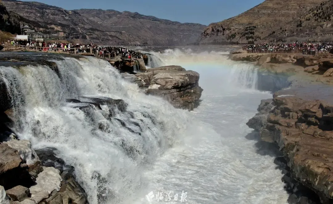 随着气温回升,黄河冰凌慢慢融化,壶口瀑布少了冬日的冰封,多了春日的磅礴。河水奔涌而下,声如惊雷,阳光洒在水雾上,一道彩虹横跨晋陕两岸,游客们纷纷拿出手机拍照打卡,欢呼声此起彼伏。