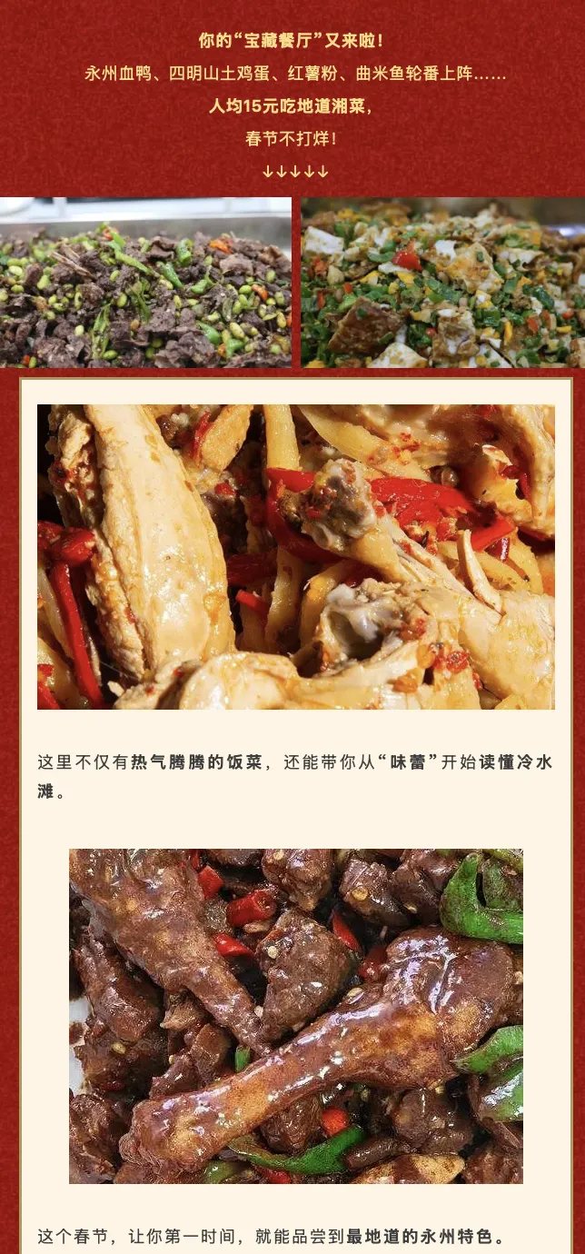 2月14日,湖南永州市冷水滩区“冷水滩发布”微信公众号发布消息《春节来永州,政府食堂喊你吃饭啦!》介绍,从农历腊月廿八一直持续到正月十五(仅限午餐时段:12:00-13:30),永州市冷水滩区政府机关食堂对外开放,永州血鸭、四明山土鸡蛋、红薯粉、曲米鱼轮番上阵……人均15元吃地道湘菜,春节不打烊!服务对象包括所有来永游客(省内外朋友,欢迎你们!)