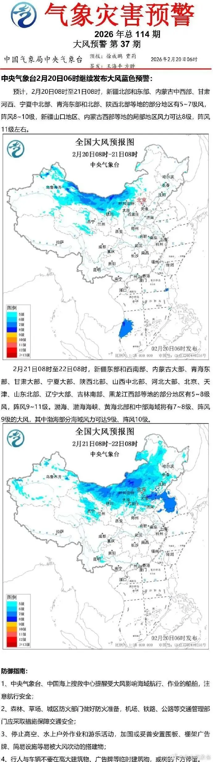 中央气象台2月20日06时继续发布大风蓝色预警。