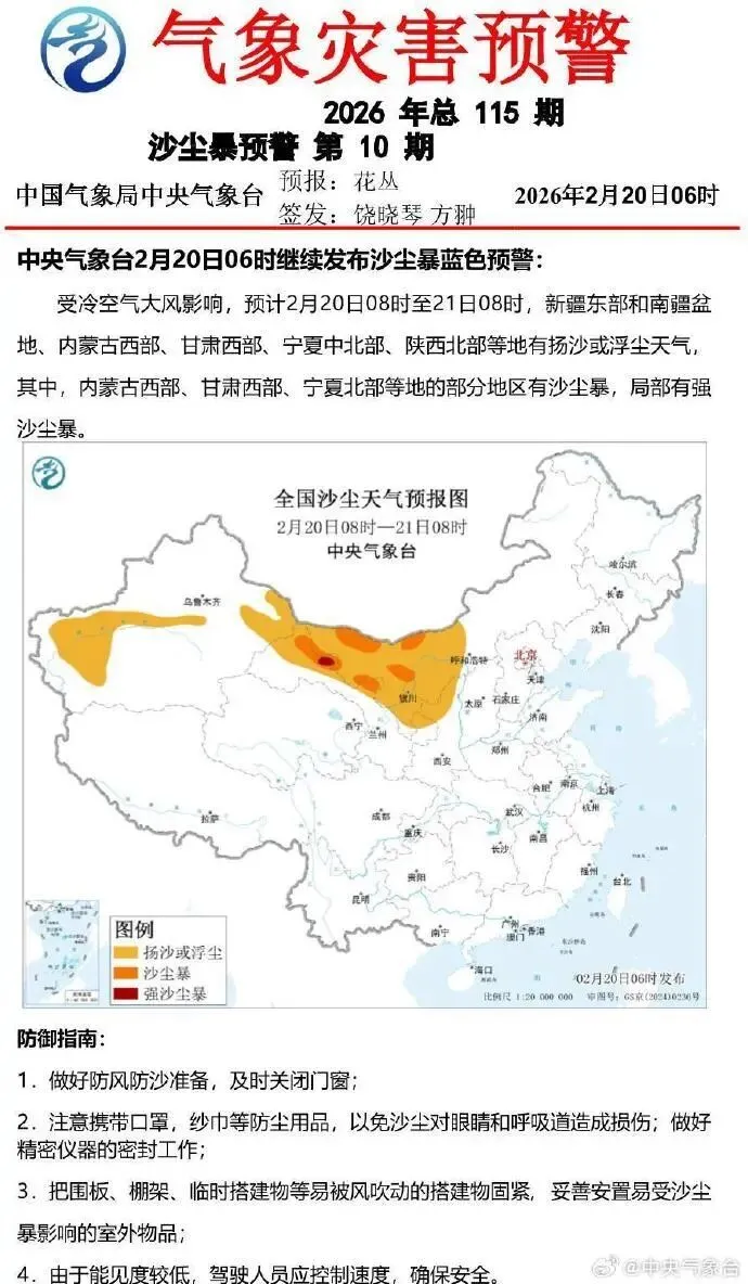 中央气象台2月20日06时继续发布沙尘暴蓝色预警。