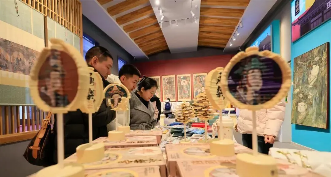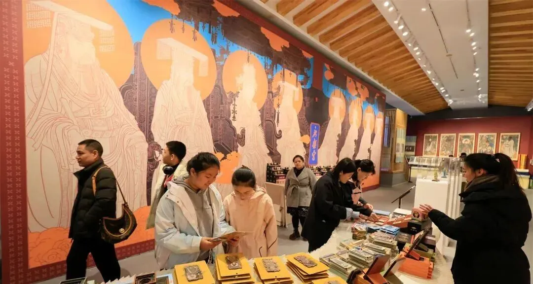 春节假期,永乐宫景区各类文化创意产品琳琅满目,以“壁画”为创意原型的文创产品受到游客青睐,吸引消费者选购。