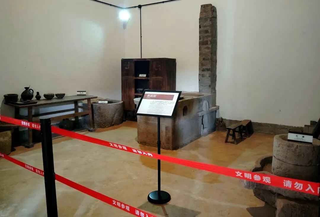 最左侧是老式厨房,水缸、灶台、石磨一应俱全,还有上了年头的锅碗瓢盆,还原了昔日农家的烟火日常。