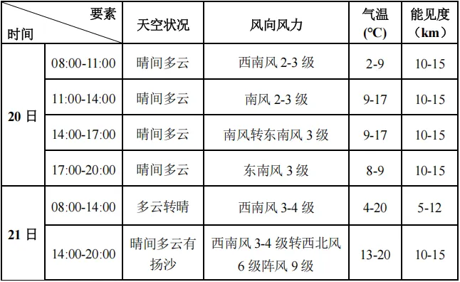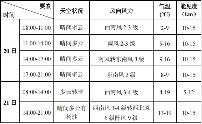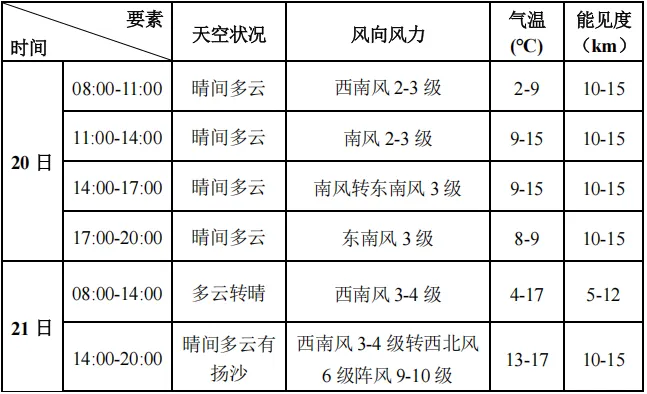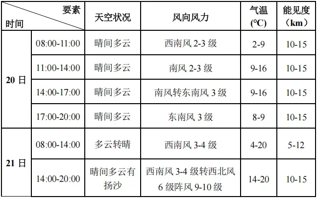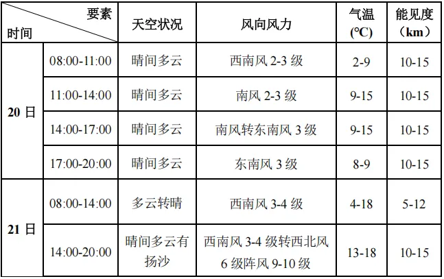 预计2月20日-21日滨海新区旅游景点以晴到多云天气为主,气温较高,白天最高气温15-20℃。预计21日傍晚(17时前后)到夜间滨海新区各旅游景点有西北风6级阵风9-10级,伴有扬沙天气,请提前防范。