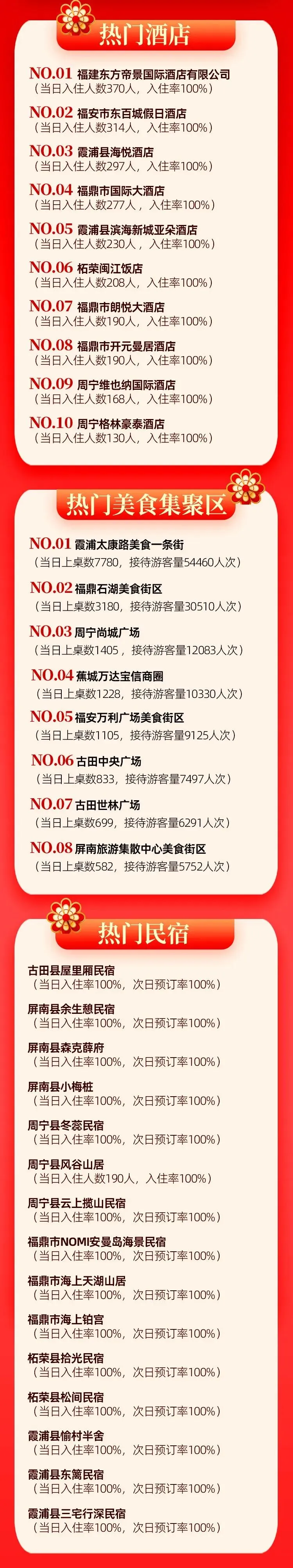 2月19日 宁德市热门榜单揭晓 霞浦东海1号风景观光道 霸榜“热门景区景点” 霞浦太康路美食一条街 位列“热门美食街区”第1 霞浦县海悦酒店 霞浦县滨海新城亚朵酒店 分别位于“热门酒店”第3、第5 霞浦县愉村半舍 霞浦县东篱民宿 霞浦县三宅行深民宿 在“热门民宿“中当日入住率