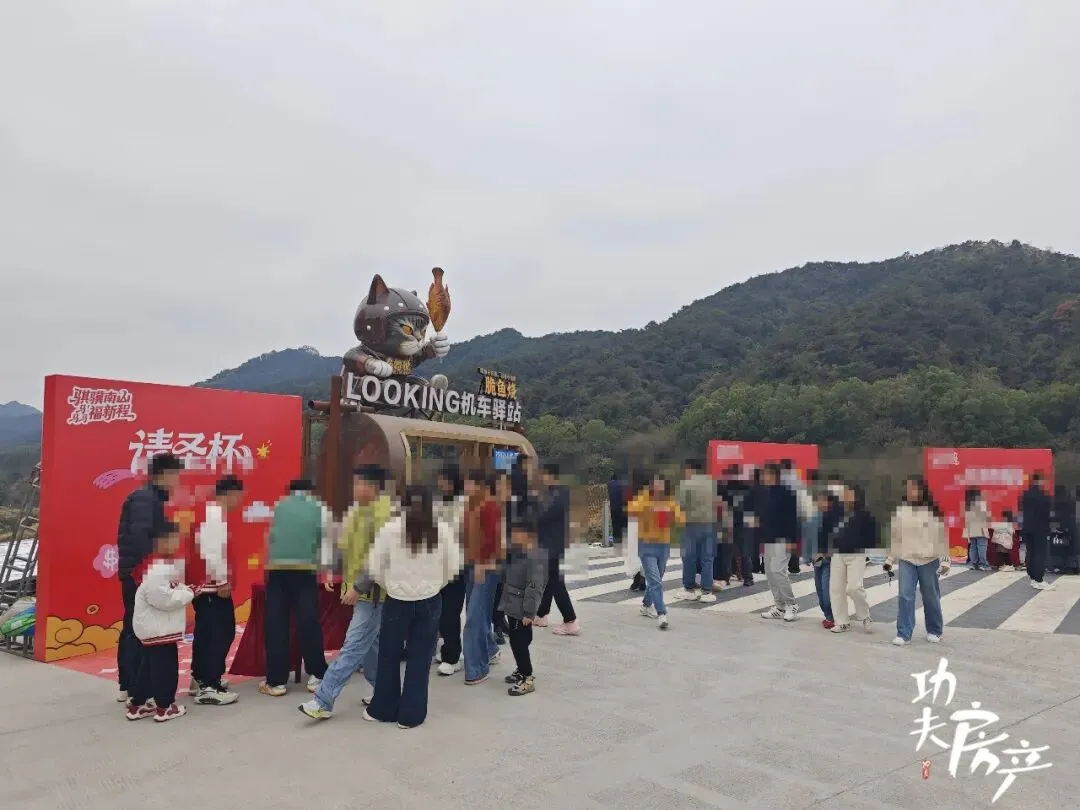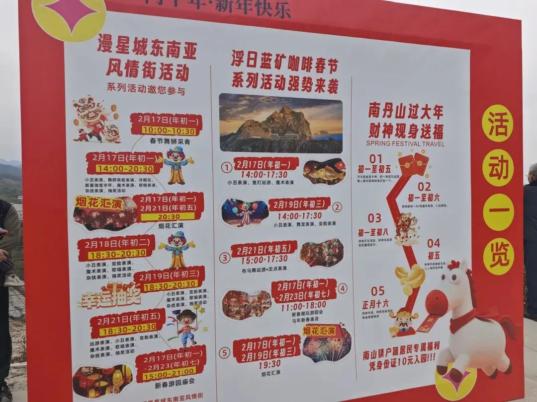 正值春节,山上更添了几分热闹,除了套圈、扔圣杯等互动游戏,通关还能兑换小礼品;此外还会安排鱼灯巡游、舞龙表演和烟花汇演,年味十足。