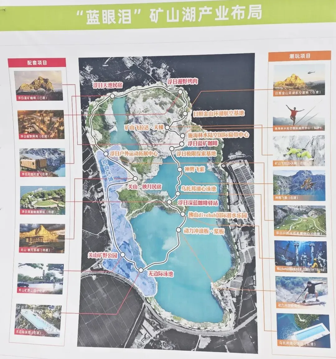 从现场的产业布局图来看,这里未来规划了不少新项目:烤肉店、天池民宿、矿野公园、无边际泳池、日照金山环湖航空基地、水陆空国际扁带中心、飞拉达·天梯、神鹰飞索、湖心泳池等。