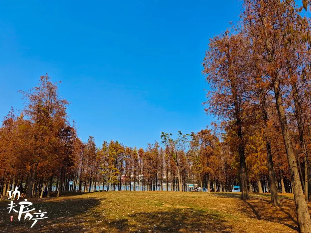 这里的江畔大草坪,因成排的落羽杉和开阔视野被称为“佛山版阿勒泰”,这里适合露营、野餐、骑行,还可体验骑马。
