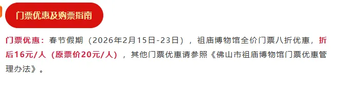 佛山祖庙博物馆(4A级景区),今年春节(2月15日-23日),祖庙门票实行八折优惠,折后仅需16元/人。