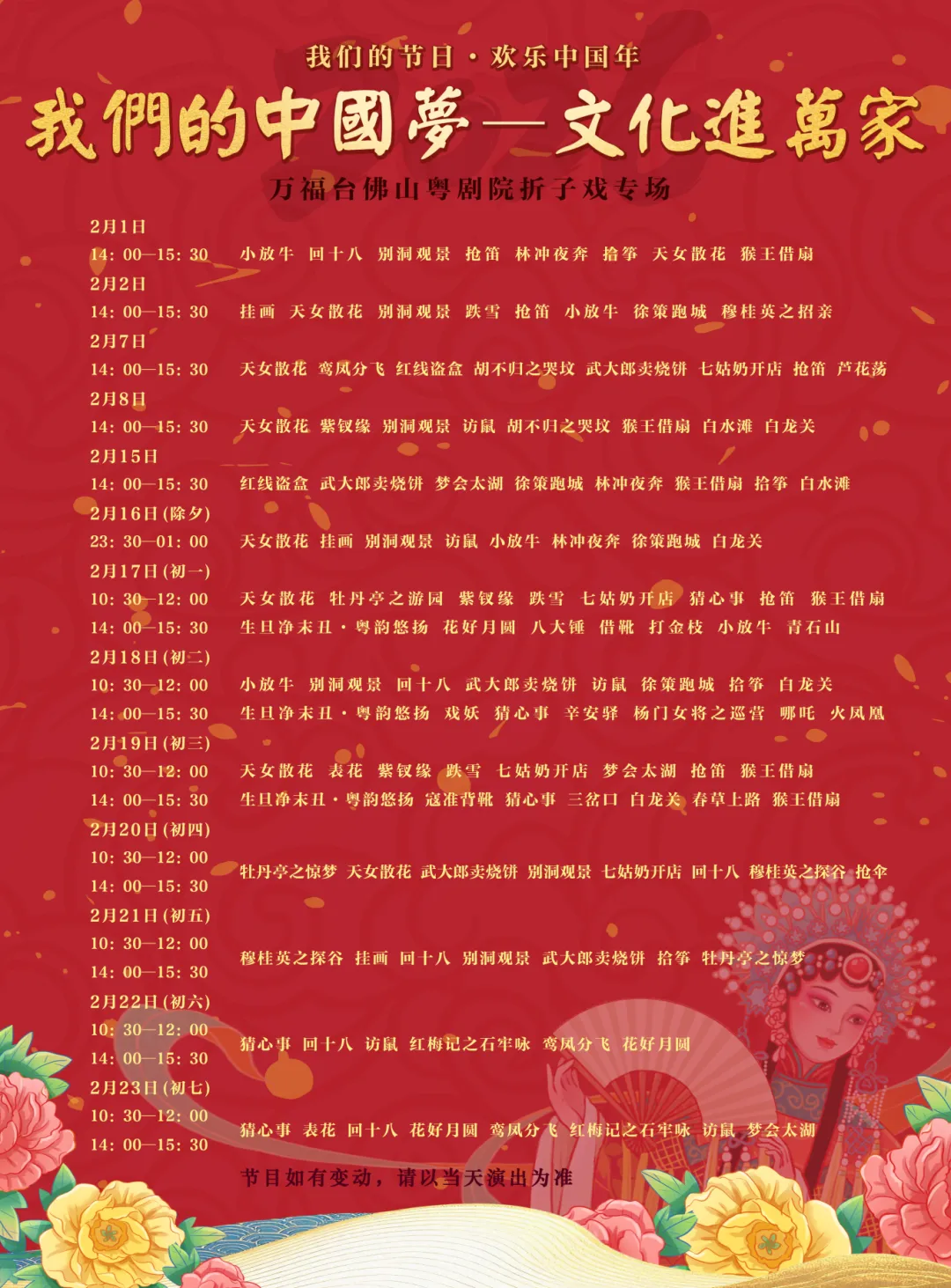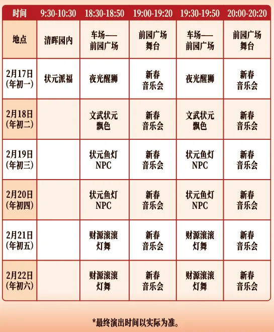 除了祈福、武术+醒狮表演外,多部经典剧目将轮番上演,带你沉浸式感受“睇大戏、贺团圆”的传统氛围,还特别策划“礼乐贺禧·岭南华章”国潮音乐会,融合传统民乐与流行曲目共贺新春。