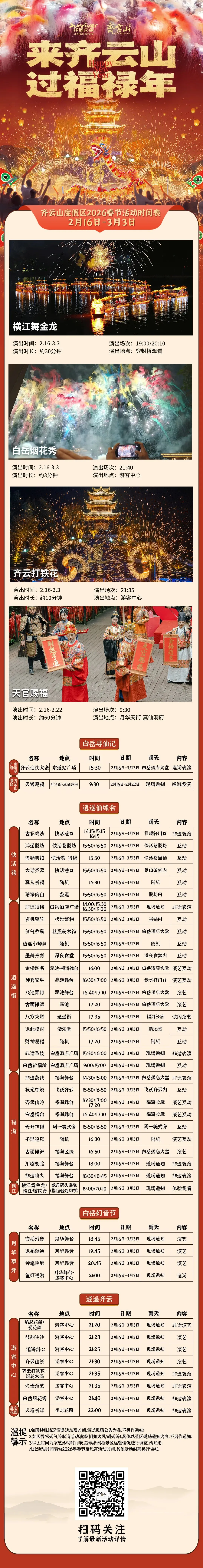 5.齐云山度假区春节活动将持续至2026年3月3日(元宵节),大型烟花秀连续放送,日游夜游活动不停,请游客合理安排出行时间,错峰出游,避免拥堵。