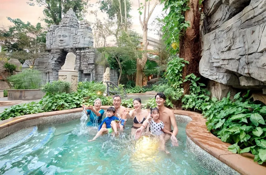 如果说电影公社是视觉的盛宴,那么火山温泉谷则是身心的犒赏。大年初一气温微凉,168个冷热泡池却热气氤氲、人声熙攘。不少家庭扶老携幼,在火山岩环绕的汤池中洗去旧岁疲惫。来自北京的刘先生一家刚泡完亚洲区和北美主题汤池:“北方的年味是饺子春晚,南方的年味是温泉阳光,观澜湖把两种美好都给了我们。”