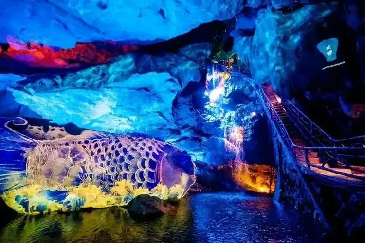 洞内钟乳石千姿百态,地下河清澈见底,搭配灯光效果宛如仙境。