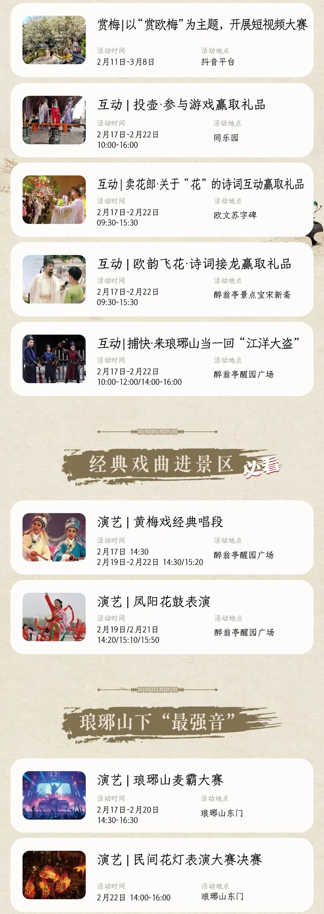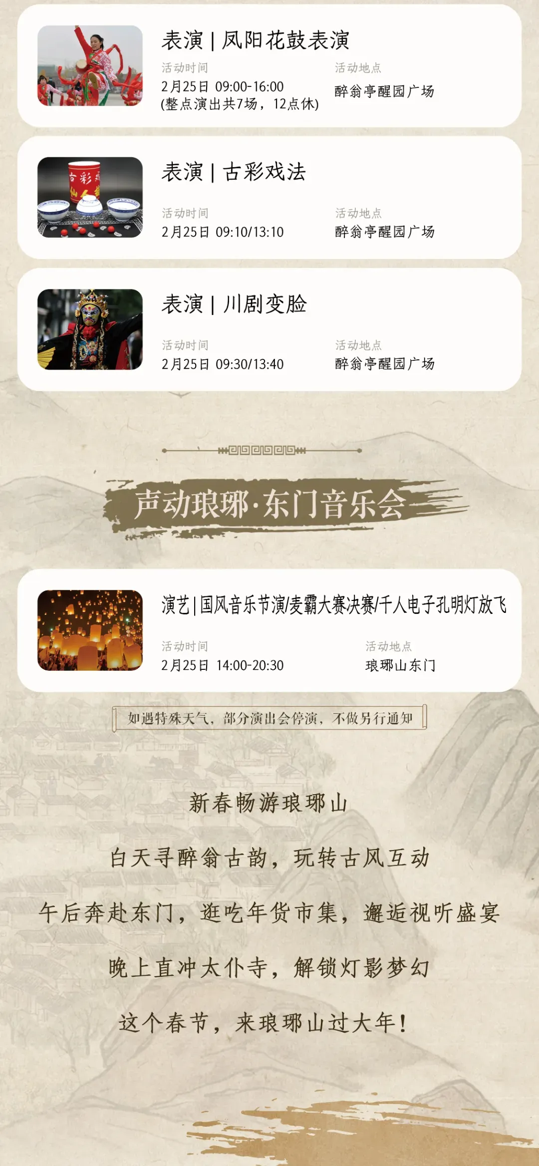 您现在的位置是:首页 > 国内旅游目的推荐 > 正文 国内旅游目的推荐 关于琅琊山景区春节期间停车与通行的温馨提示 admin2026年02月20日 18:09:10国内旅游目的推荐11 关于琅琊山景区春节期间停车与通行的温馨提示亲爱的游客朋友们:大家好!为保障景区通行顺畅与游览安全,温馨提示:琅琊山北门停车场车位有限,节假日高峰时段易饱和。相关路段适时启动临时交通管制。建议您优先导航至琅琊山东门。感谢您的理解与配合,祝您旅途愉快!2026年2月20日琅琊山景区编辑:贾 露,初审:周庆瑜复审:陈高洁,终审:戴 莺 转载请说明来源于"旅荐网",部分内容转载自网络,如有侵权请联系qlwl@foxmail.com删除 本文地址:https://www.15386.cn/post/116166.html 上一篇 中国最适合冬日避寒的6个AAAAA景区,均温18℃!去过3个就是暖冬博主! 下一篇 【国家】比肩丹娜岛!中区又一座“旅游新城”崛起 相关文章 政策丨2025年度入境旅游奖励申报启动 4月瓦房店普兰店出发旅游计划 【泰国政治】不再60天!泰国旅游部长:计划缩短免签停留期,提升高端游客质量 对不起!您的旅行计划我承包了,就问你去不去? 国庆长假刚结束,下一次旅行的计划已经给你安排上了 本以为旅行不用计划,却不料处处踩坑 每月解锁一地!2024浙江旅行计划出炉,一起去啊~ 藏不住了!宝藏级网红旅行计划现在揭秘,隐藏绝美秘境速来打卡~ 这趟春天旅行没有做攻略,但一路走下来反而比想象中更好玩 夏日出游丨TJU旅行计划 发表评论 取消回复 评论列表 这篇文章还没有收到评论,赶紧来抢沙发吧~