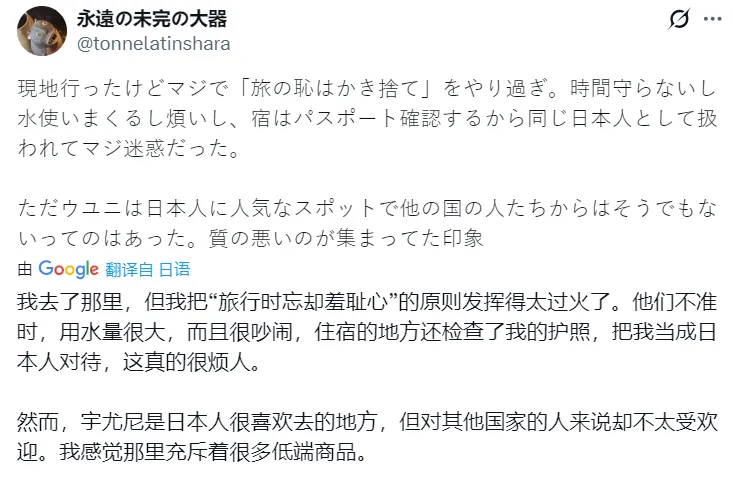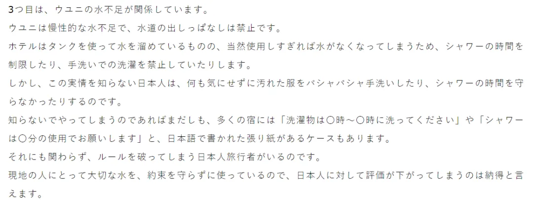 有网友表示,日本人真的把“出门在外不怕丢脸”这件事发挥到极致,各种又吵又闹,还用水量极大。而且旅馆因为要检查护照,导致我我也被当成跟他们一样的日本人对待,真的很困扰。