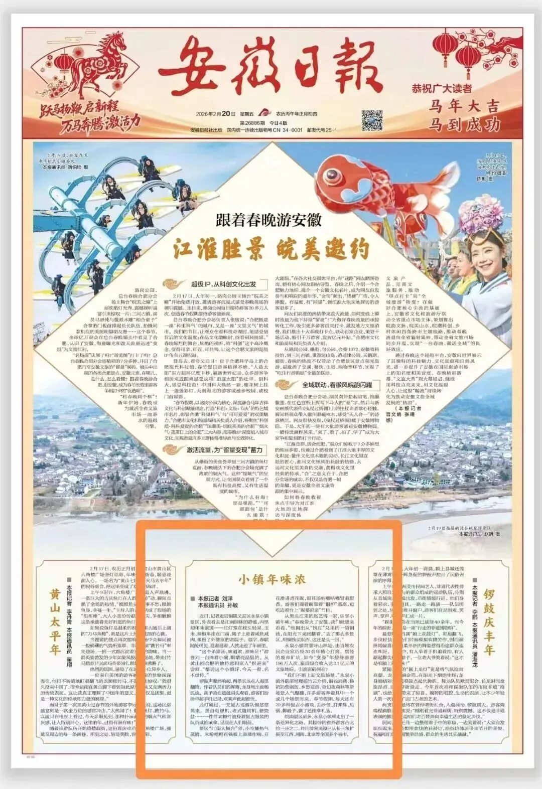 2月20日《安徽日报》 头版刊发《小镇年味浓》: 近日,记者走进铜陵义安区永泉小镇景区,外表看去是江南园林的静谧,内里却年味滚烫——红灯笼在枝头轻晃,玉米、辣椒串挂在门前,绳子上悬着咸鱼咸肉,像极了外婆家的老院子。福字、春联随处可见,逛着逛着,人就走进了年画里。